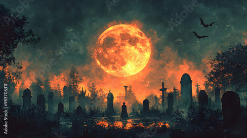Watercolor-style cemetery under a full moon, with bats flying across the night sky, perfect for a spooky Halloween scene.