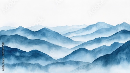 Watercolor-style painting of mountain ranges with mist covering the lower portions