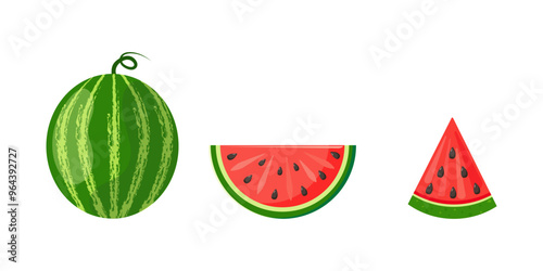 Watermelon and watermelon slices icon in flat style on white background. For project design, vegan products. Vector graphics