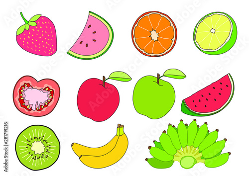 Watermelon Orange Lemon Tomato Apple red Apple green Kiwi Strawberry and Banana Fruit on white background illustration vector