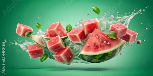 Watermelon Splash Cubes and Slices in Motion, Green Background, Water Splash, Summer, Refreshing, Fruit, Watermelon
