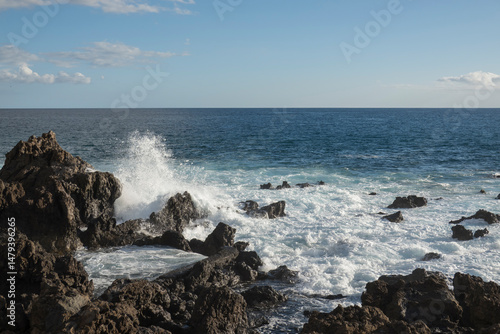 Waves Crashing Against black Lava Rocks on a Tropical Coast, water splashing at canary island Tenerife