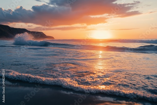 Waves of the ocean gently crash against the shoreline during a colorful sunset, with a distant cliff in the background.