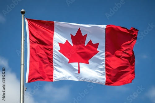 Waving Canadian flag against a bright blue sky, symbolizing national pride and unity in a peaceful nature setting