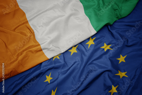 waving colorful flag of european union and flag of cote divoire.