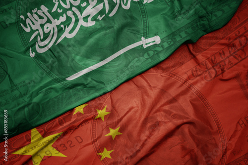waving colorful flag of saudi arabia and national flag of china on the dollar money background. finance concept.