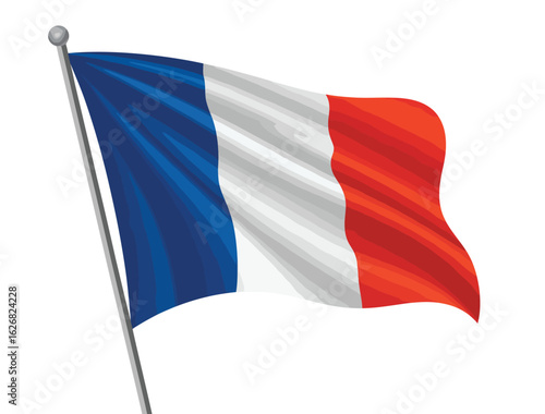 Waving French national flag on flagpole with vertical blue, white, and red stripes—symbol of liberty, unity, and cultural pride