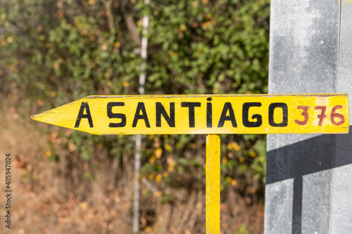 Way of Saint James signpost in Moratinos village showing the distance (376km) to Santiago de Compostela
