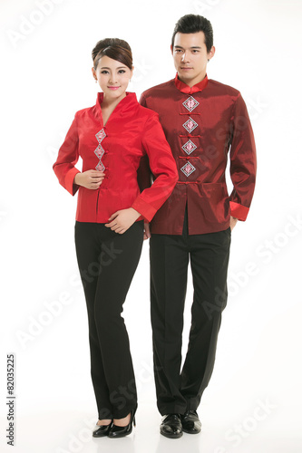 Wearing Chinese clothing waiter in front of a white background