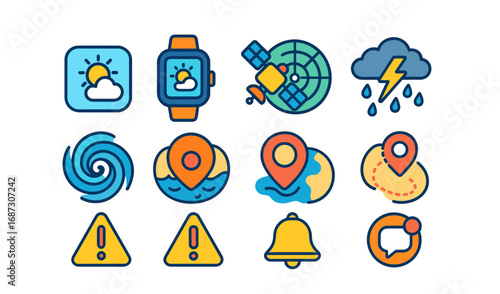 Weather and navigation icon set. colorful line symbols for forecast and location apps