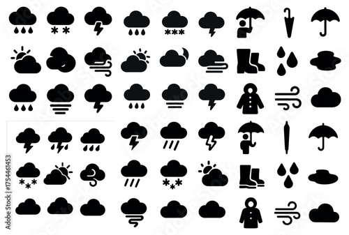 Weather silhouette icons set – cloud, rain, storm symbols for forecasts