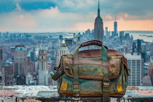 Weathered bag near the edge of a rooftop with a stunning view of the New York City skyline at sunset, showcasing iconic buildings under a dramatic sky