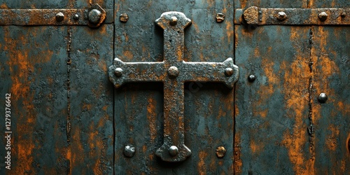 Weathered metal door featuring a prominent cross symbol in a rustic setting