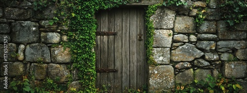 Weathered stone wall, wooden door draped in lush moss and ivy, a glimpse into nature's reclamation and history's embrace