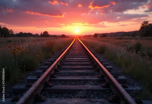 weathered train tracks sunset journey landscape rustic mood twilight vivid colors horizon railroad scenic view, sky, evening, nature, travel, shadow, reflection