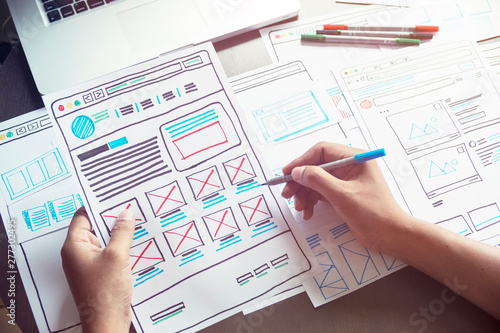 Website designer Creative planning application developer development draft sketch drawing template layout prototype framework wireframe design studio . User experience concept .