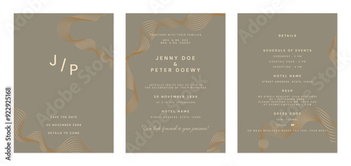 Wedding invitation template set, minimalist wavy line art in elegant green and brown tones