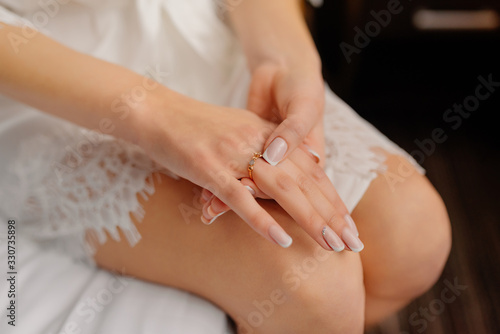 Wedding morning preparation. Happy bride holds hands on her knees and touch engagement ring