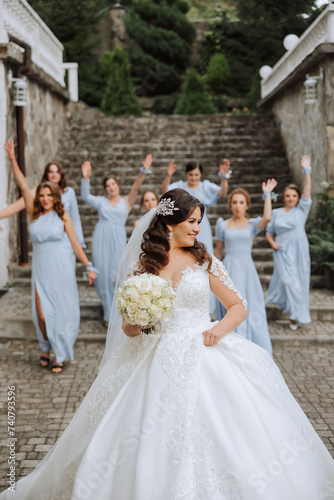 Wedding photography. A brunette bride in a white dress with a bouquet and her brunette girlfriends