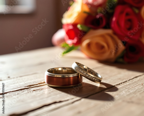 Wedding rings and a vibrant bouquet reflect love and commitment in a sunny room, symbolizing a beautiful union between partners