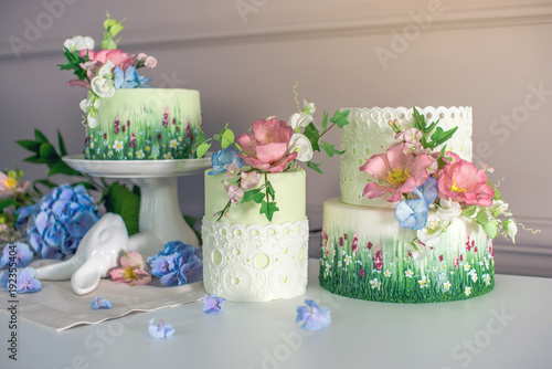 Wedding spring cake decorated with colorful flowers and hydrangeas. Desserts for a festive summer mood