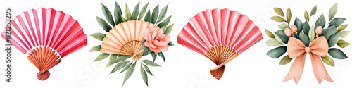 Wedding watercolor and groom delicate, Four decorative fans featuring vibrant colors, floral elements, and elegant ribbons, showcasing intricate designs and craftsmanship.