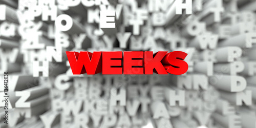 WEEKS - Red text on typography background - 3D rendered royalty free stock image. This image can be used for an online website banner ad or a print postcard.