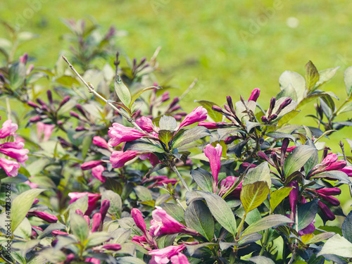 Weigelia pourpre nain ou Weigela Florida nana Purpurea aux branches couvertes de boutons floraux rougeâtre dans un feuillage vert marginé de pourpre