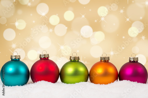 Weihnachten bunte Weihnachtskugeln in einer Reihe gold Hintergru