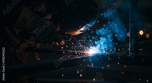 Welder Working with Sparks in Dark Setting Using Protective Gear