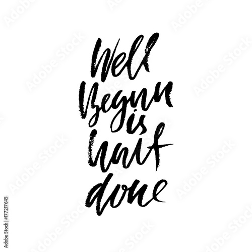 Well begun is half done. Inspirational and motivational quote. Hand painted brush lettering. Handwritten modern typography. Vector illustration.