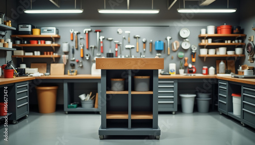 Well-organized workshop with tools, equipment, and a central workstation in a modern setting