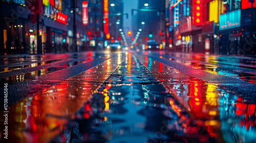 Wet city crosswalk at dusk reflecting colorful ambient light from shops and traffic, with strong perspective and moody urban atmosphere