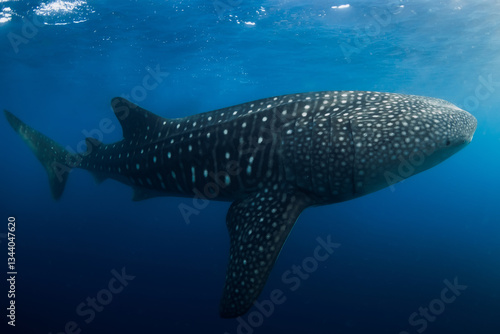 Whale shark in blue ocean. Giant whale shark swimming underwater in tropical waters