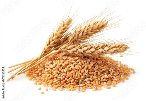 Wheat ears and grains. A pile of wheat grains with three wheat ears. Golden-toned wheat kernels, and dry, light-brown wheat stalks. Isolated on white