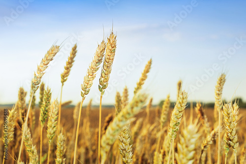 Wheat field. Ears of golden wheat. Beautiful Sunset Landscape. Background of ripening ears. Ripe cereal crop. close up.