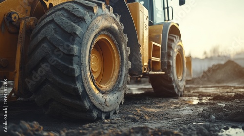 Wheeled Earthmover Rests on Muddy Construction Site at Dusk
