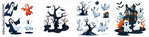 Whimsical ghost illustrations perfect for Halloween with playful designs, haunted trees, and spooky houses.