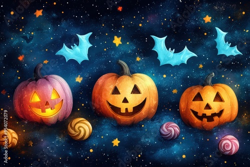 Whimsical Halloween Seamless Background with Cute Bats, Candy, and Little Witches for Kids' Prints