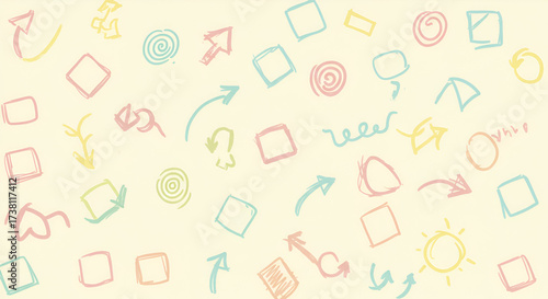 Whimsical Hand-Drawn Pastel Shapes and Arrows Pattern Background Design