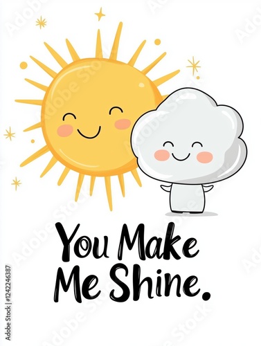 Whimsical illustration of a smiling sun and cloud characters, with 'You Make Me Shine' text, surrounded by simple colorful designs