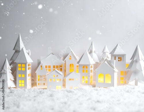 Whimsical paper village scene under a soft, snowy atmosphere