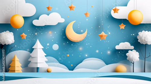 whimsical scene with crescent moon, stars, and clouds in dreamy sky, featuring hanging decorations and stylized trees, creating magical atmosphere
