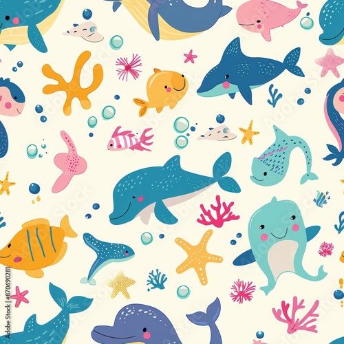 Whimsical Underwater Wonderland: Adorable Sea Creatures in a Playful, Seamless Design