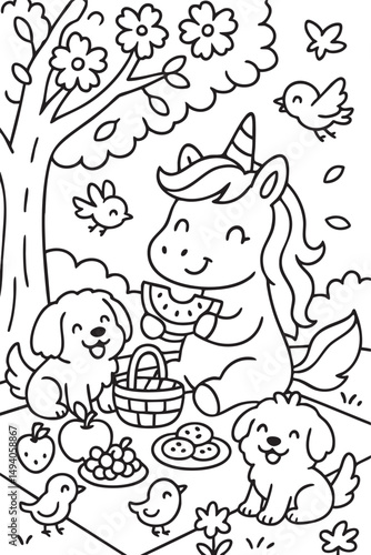 Whimsical Unicorn Scene for Children’s Coloring Book