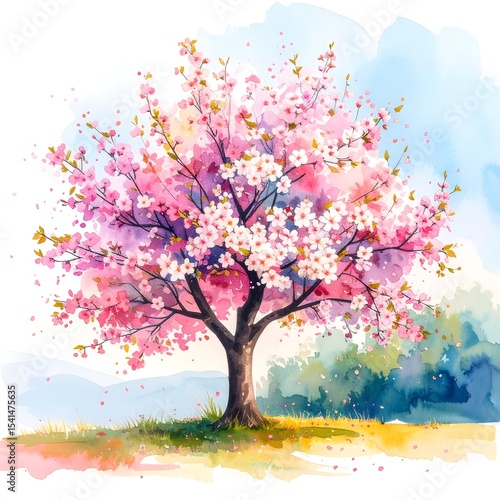 Whimsical watercolor study of a blooming cherry blossom tree in full pink floral glory