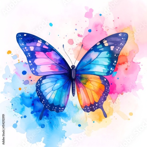 Whimsical watercolor study of a butterfly resting on a soft and colorful watercolor background