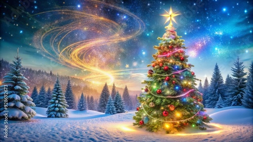 Whimsical winter wonderland scene featuring sparkling snowflakes, twinkling lights, and a vibrant swirl of colorful magic surrounding a majestic evergreen Christmas tree.