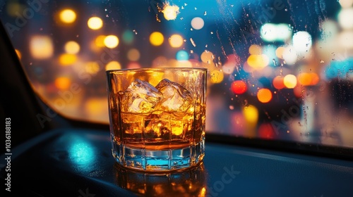 Whiskey glass with ice showcased from a car window at night capturing the essence of urban life and adventure