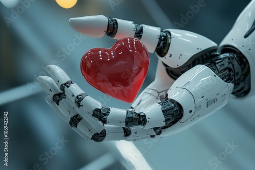 White ai robot offering a red heart symbolizing love on grey background, empathy and compassion